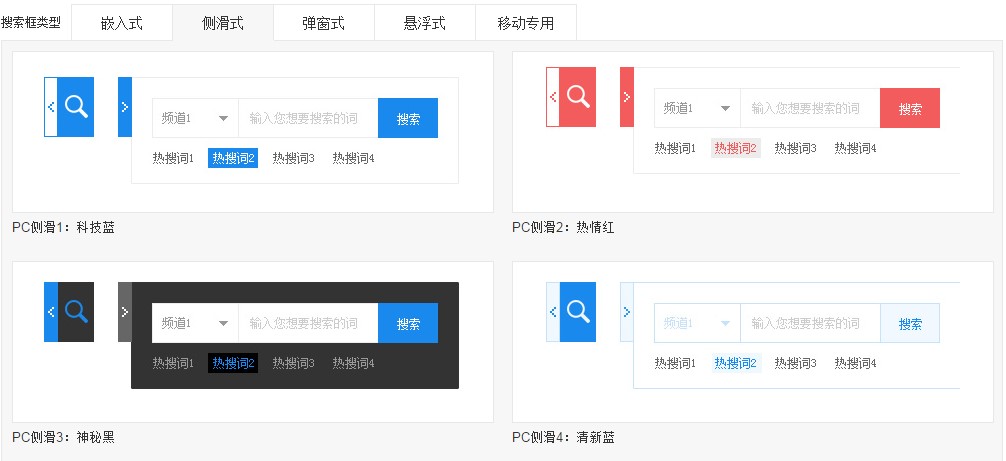 以上类型的搜索框均可在后台“搜索框管理“—>”搜索框列表“中搜索框列表后点击”更换模板“,在如下界面进行选择: