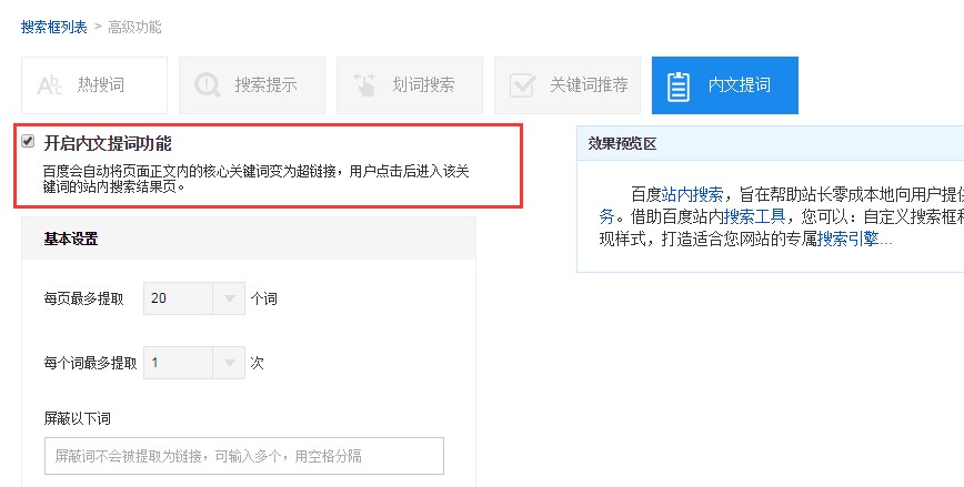 内文提词可在后台“搜索框管理“—>”搜索框列表“中搜索框列表后点击”高级功能“,在如下位置开启: