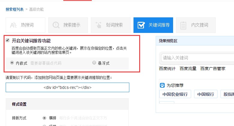 若您希望开启的是内嵌式的关键词推荐,还需要将<div id=”bdcs-rec”></div>放置您页面上需要展示关键词推荐的位置,您可以将这行代码部署在您文章的开头或结尾或您希望的其余位置。此外,内嵌式的关键词推荐可支持横排与竖排展示两种方式。竖排展示可在较窄的区域内进行展示。若选用内嵌式关键词推荐的同时未放置代码,会导致关键词推荐无法展示。